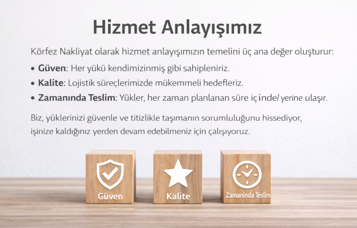 Körfez Nakliyat olarak hizmet anlayışımızın temelinde güven, kalite ve zamanında teslimat yer almaktadır. Taşımacılığın yalnızca yük taşımak değil, aynı zamanda büyük bir sorumluluk olduğunu biliyor; her yükü kendi yükümüz gibi sahipleniyoruz.